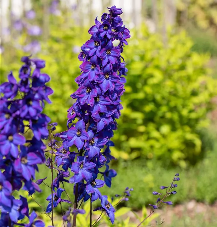 Delphinium pacific 'Black Knight' bildet gefüllte, in Rispen angeordnete, violette Blüten ab Juni. Bei richtiger Pflege Nachblüte von September bis Oktober.