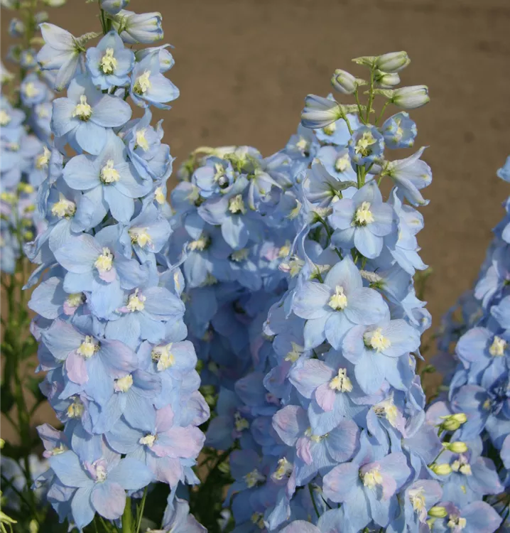 Delphinium x elatum 'Sommerwind' bildet schalenförmige, in Rispen angeordnete, hellblau-weiße Blüten ab Juni. Bei richtiger Pflege Nachblüte von September bis Oktober.