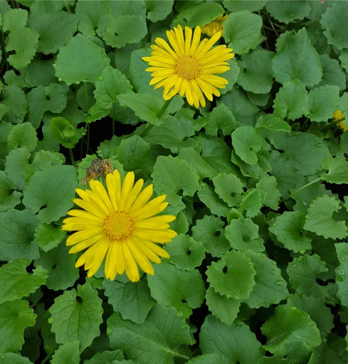 Doronicum orientale 'Little Leo' bildet halbgefüllte, körbchenartige, goldgelbe Blüten ab April.