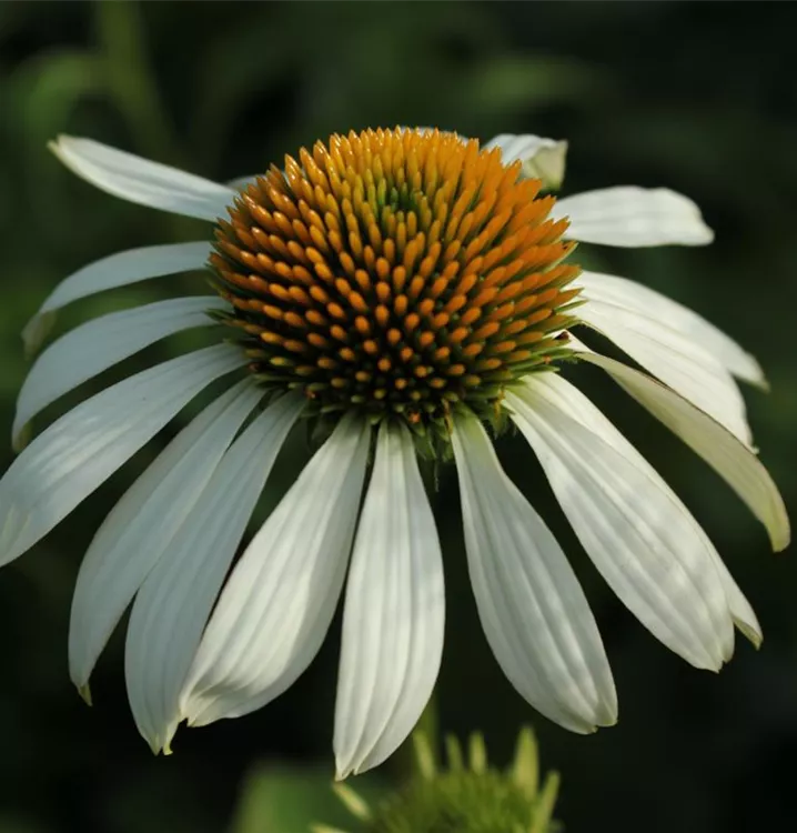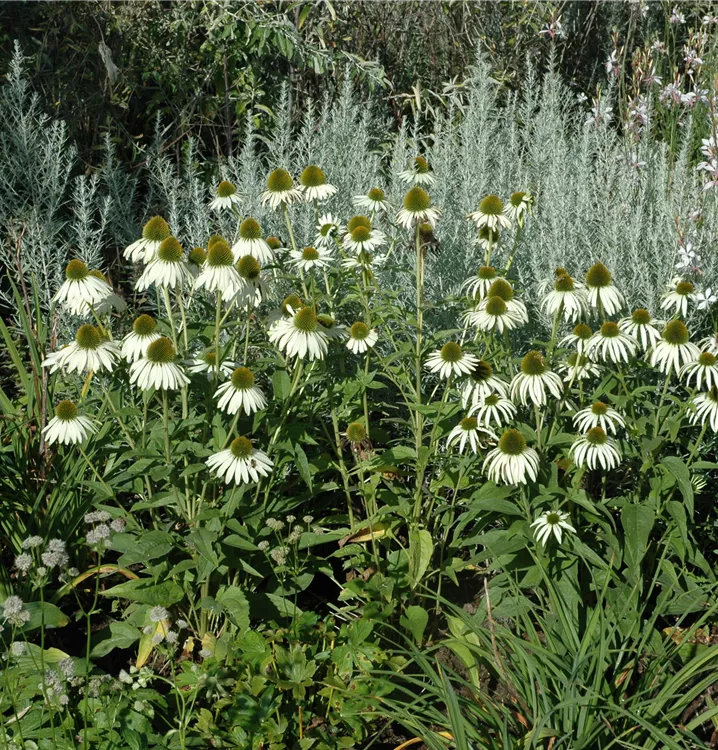 Der Purpur-Sonnenhut 'Alba' (Echinacea purpurea 'Alba') ist eine der langlebigeren Sorten und blüht weiß; das Körbchen ist grünlich und orange. Die Zungenblüten stehen zunächst waagerecht ab und biegen sich beim Abblühen nach unten. Versamt sich sortenecht.