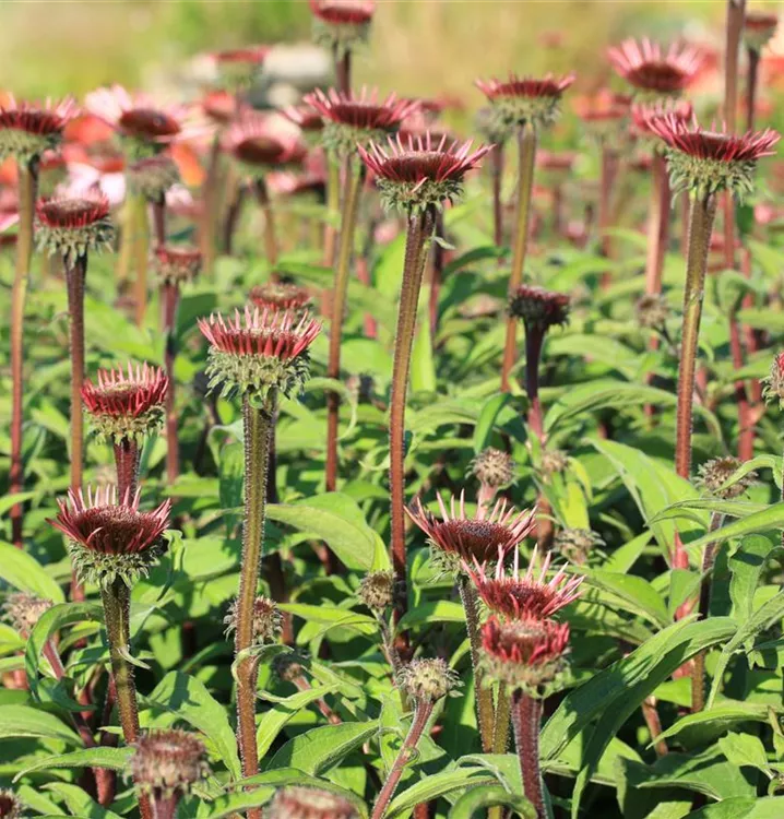 Purpur-Sonnenhüte tragen im Sommer große Körbchenblüten in auffälligen Farben, die leicht nach Honig duften und insbesondere bei Schmetterlingen und Honigbienen sehr beliebt sind. Der botanische Name leitet sich von dem griechischen Wort Echinos= Igel ab, weil das gewölbte, stachelige Körbchen in der Mitte an einen Igel erinnert. Die Blüten sind auch wunderbar zum Schnitt geeignet, sie halten sich 7 Tage und länger in der Vase. Die schwarz-braunen, kugeligen Samenstände sind bis in den Winter hinein dekorativ, v.a. im Kontrast mit Gräsern, die eine gelbe Herbstfärbung zeigen.