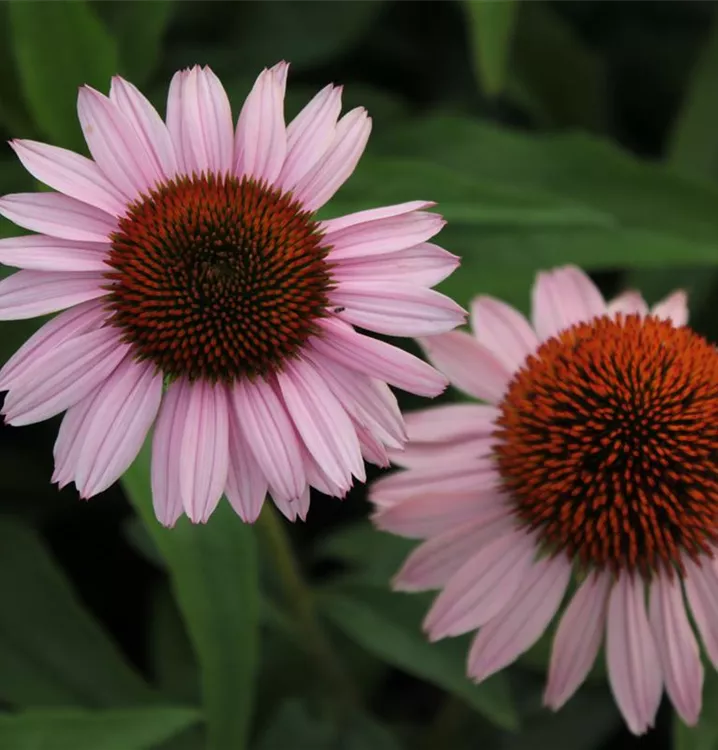Der Purpur-Sonnenhut 'Hope' -R- (Echinacea purpurea 'Hope' -R-) blüht in einem zarten Rosa mit einem großen, orangebraunen Körbchen in der Mitte. Die Sorte ist sehr reichblütig, aber eher kurzlebig.