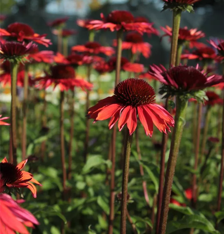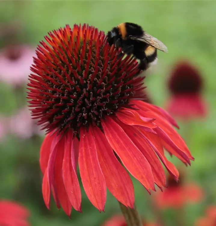 Purpur-Sonnenhüte tragen im Sommer große, auffällige Körbchenblüten in auffälligen Farben, die leicht nach Honig duften und insbesondere bei Schmetterlingen und Honigbienen sehr beliebt sind. Der botanische Name leitet sich von dem griechischen Wort Echinos= Igel ab, weil das gewölbte, stachelige Körbchen in der Mitte an einen Igel erinnert. Die Blüten sind auch wunderbar zum Schnitt geeignet, sie halten sich 7 Tage und länger in der Vase. Die schwarz-braunen kugeligen Samenstände sind bis in den Winter hinein dekorativ, v.a. im Kontrast mit Gräsern, die eine gelbe Herbstfärbung zeigen.