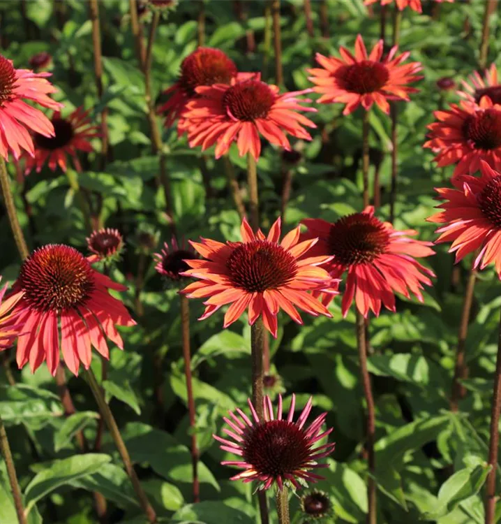 Der Purpur-Sonnenhut 'Hot Summer' -R- (Echinacea purpurea 'Hot Summer' -R-) ist bisweilen kurzlebig, überzeugt jedoch durch seinen intensiven Farbwechsel: Die Blüten öffnen sich in einem leuchtenden Orangerot und verändern sich im Laufe der Blütezeit zu einem verwaschenen Rot. Die Zungenblüten sind breit, stehen zunächst waagerecht ab und neigen sich später elegant nach unten. Das Körbchen zeigt ein warmes Rotbraun. Wie alle Sorten ist auch 'Hot Summer' -R- ausgesprochen reichblütig.