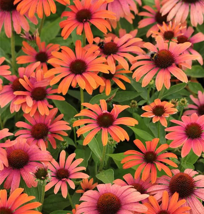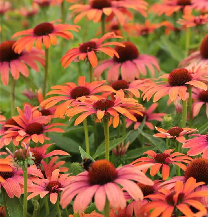 Der Purpur-Sonnenhut 'Julia' -R- (Echinacea purpurea 'Julia' -R-) ist eine recht neue, mit etwa 45 cm Höhe kompakt bleibende Sorte, die auch im Kübel sehr gut zur Geltung kommt. Die Blüten öffnen sich in einem leuchtenden Mandarinenorange und hellen im Verlauf der Blüte zu Orange und Rosa auf.
