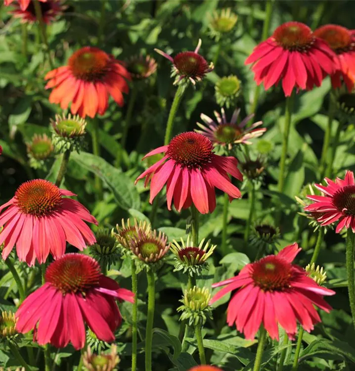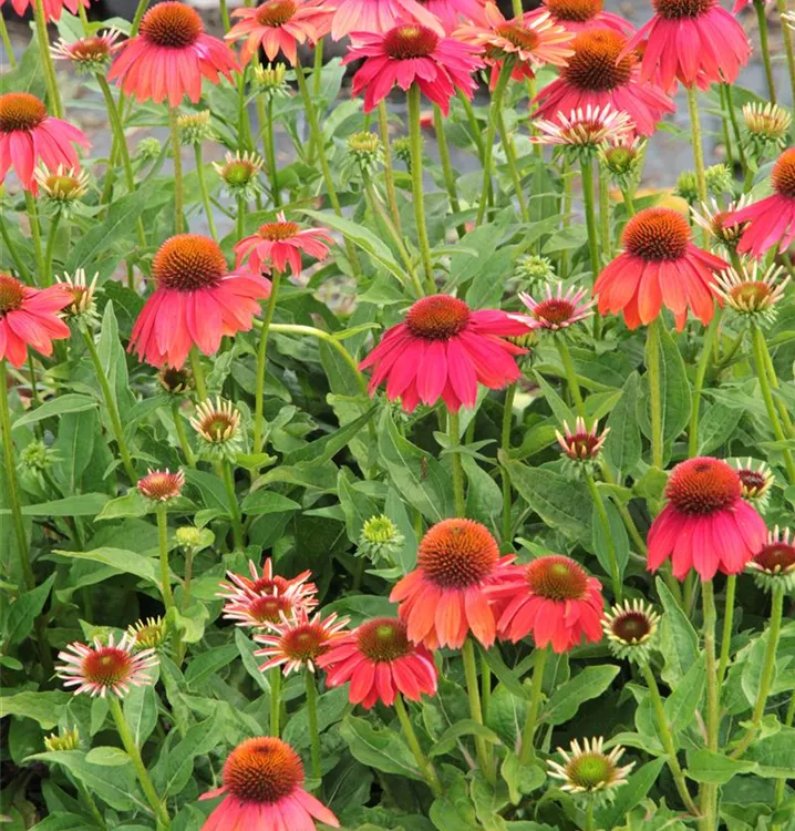 Der Purpur-Sonnenhut 'LaKota Red' -R- (Echinacea purpurea 'LaKota Red' -R-) ist eine kompakte neue Sämlingssorte aus der LaKota-Serie. Sie öffnet sich in einem violettstichigen Rot und verblasst während der Blütezeit etwas nach Pink und Orange. Eine schöne Sorte für Kübelpflanzungen.