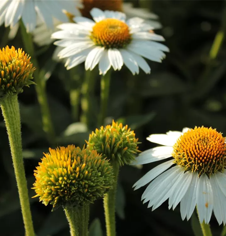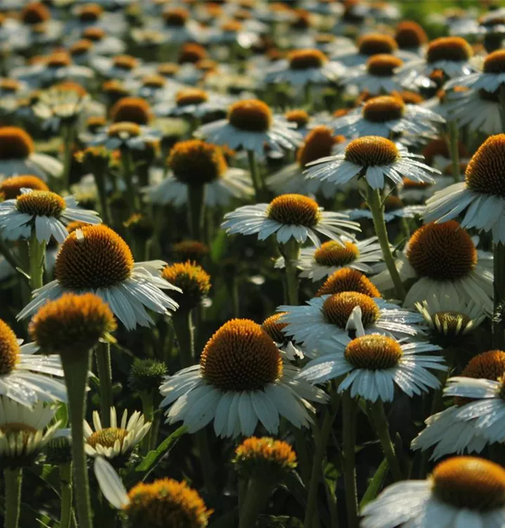 Purpur-Sonnenhüte tragen im Sommer große Körbchenblüten in auffälligen Farben, die leicht nach Honig duften und insbesondere bei Schmetterlingen und Honigbienen sehr beliebt sind. Der botanische Name leitet sich von dem griechischen Wort Echinos= Igel ab, weil das gewölbte, stachelige Körbchen in der Mitte an einen Igel erinnert. Die Blüten sind auch wunderbar zum Schnitt geeignet, sie halten sich 7 Tage und länger in der Vase. Die schwarz-braunen, kugeligen Samenstände sind bis in den Winter hinein dekorativ, v.a. im Kontrast mit Gräsern, die eine gelbe Herbstfärbung zeigen.