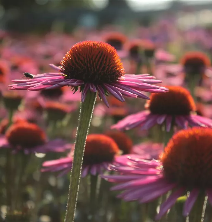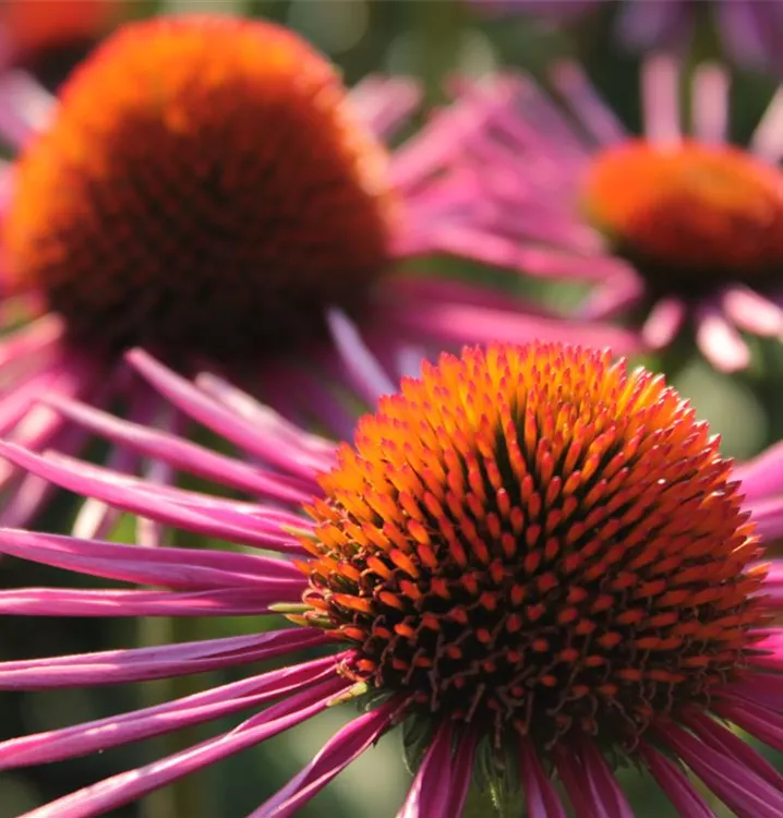 Purpur-Sonnenhüte tragen im Sommer große Körbchenblüten in auffälligen Farben, die leicht nach Honig duften und insbesondere bei Schmetterlingen und Honigbienen sehr beliebt sind. Der botanische Name leitet sich von dem griechischen Wort Echinos= Igel ab, weil das gewölbte, stachelige Körbchen in der Mitte an einen Igel erinnert. Die Blüten sind auch wunderbar zum Schnitt geeignet, sie halten sich 7 Tage und länger in der Vase. Die schwarz-braunen, kugeligen Samenstände sind bis in den Winter hinein dekorativ, v.a. im Kontrast mit Gräsern, die eine gelbe Herbstfärbung zeigen.