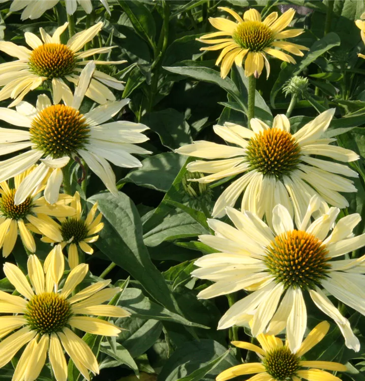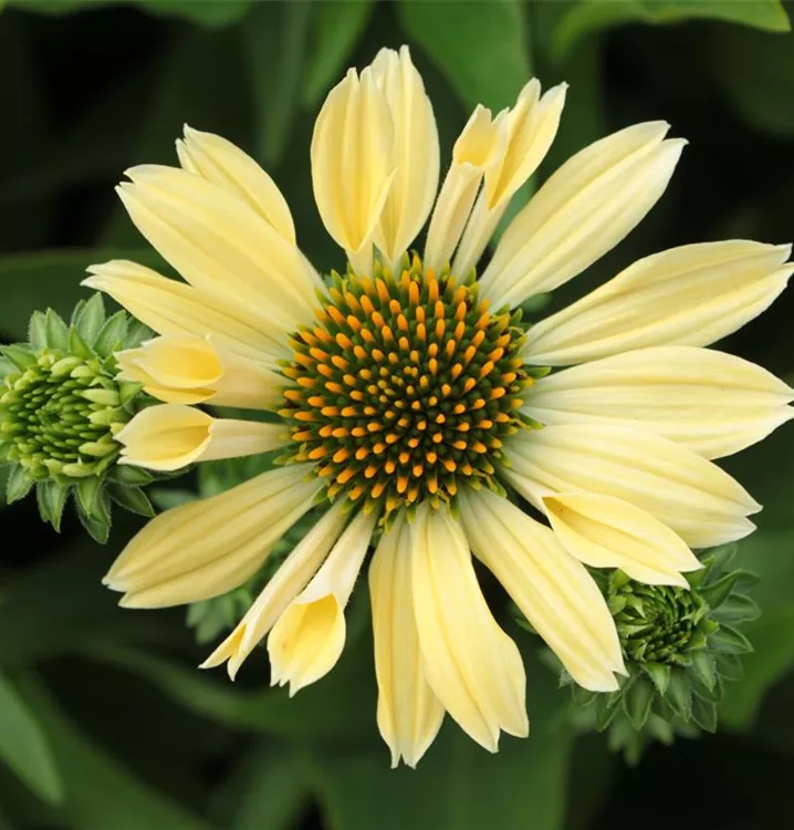 Der Purpur-Sonnenhut 'Sunrise' (Echinacea purpurea 'Sunrise') blüht in einem warmen Hellgelb, das im Verlauf der Blüte zunehmend aufhellt. Charakteristisch für diese Sorte ist, dass einige Zungenblüten teilweise röhrenförmig bleiben und sich nicht vollständig entfalten.