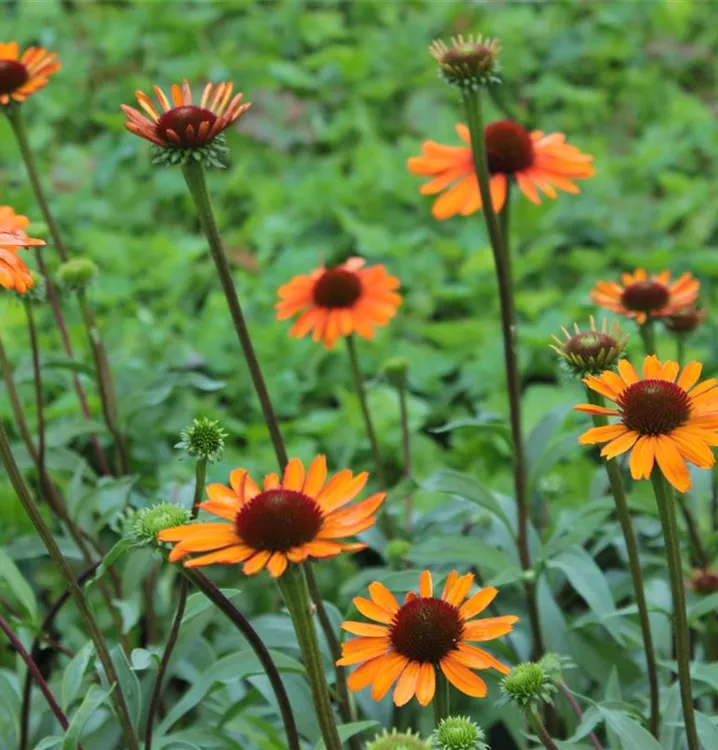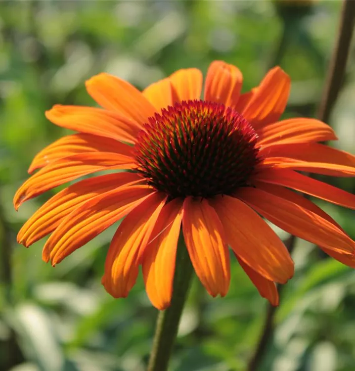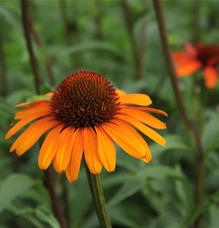 Der Purpur-Sonnenhut 'Tiki Torch' -R- (Echinacea purpurea 'Tiki Torch' -R-) ist eine eher kurzlebige Sorte, besticht jedoch durch ihre leuchtend orangefarbene Blüte mit rotem Körbchen und breiten Zungenblüten. Die Stängel sind lang, kräftig und leicht rötlich gefärbt.