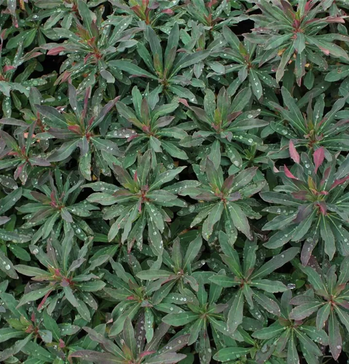 Die wintergrünen Blätter der Mandelblättrige Garten-Wolfsmilch 'Purpurea' sind dunkelrot, lanzettlich.