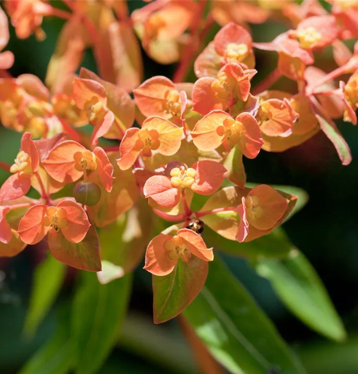 Einen exotischen Blickfang bildet die Mandelblättrige Wolfsmilch Euphorbia amygdaloides. Während die ausgewachsenen Blätter der Staude ein dunkles Grün tragen, besticht das junge Laub der Sorte 'Purpurea' durch ein fesselndes Rotbraun. Ebenso auffällig wie die Färbung der jungen Blätter sind die gelbgrünen, rot gestielten Blütenstände. Der aufrechte Wuchs und die Winterhärte der Pflanzen prädestinieren diese Stauden zur Begrünung kahler Außenflächen.