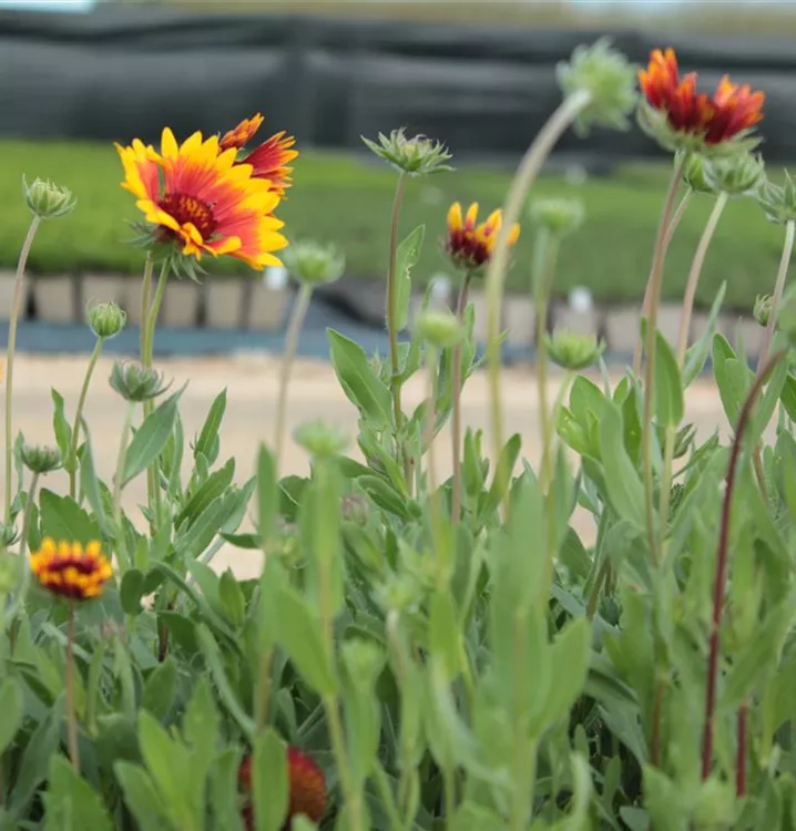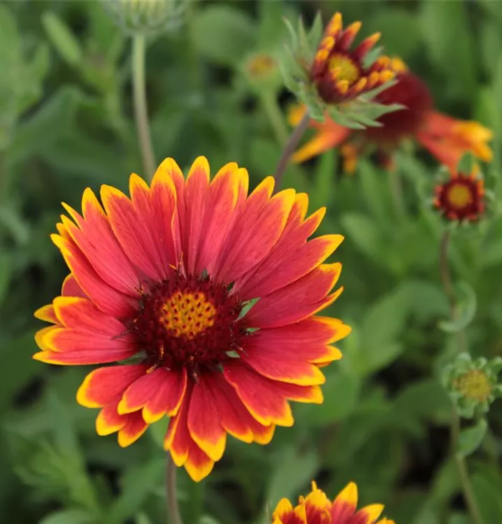 Gaillardia x grandiflora 'Bremen' bildet körbchenartige, rot-gelbe Blüten ab Juli.