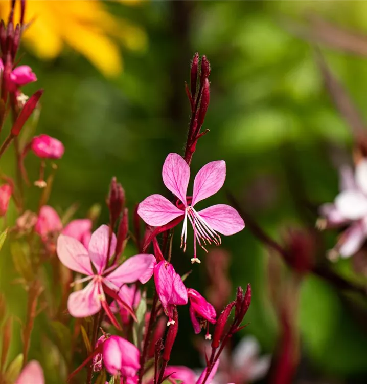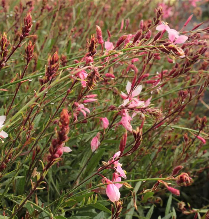 Gaura lindheimeri 'Cherry Brandy' bildet in Rispen angeordnete, rosafarbene Blüten ab Juli.