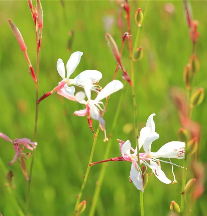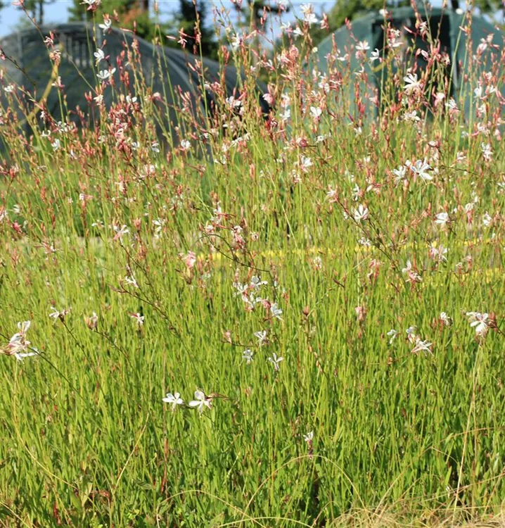 Gaura lindheimeri 'Elurra' bildet in Rispen angeordnete, weiße Blüten ab Juli.