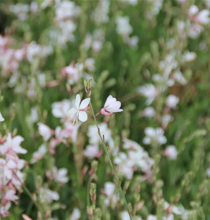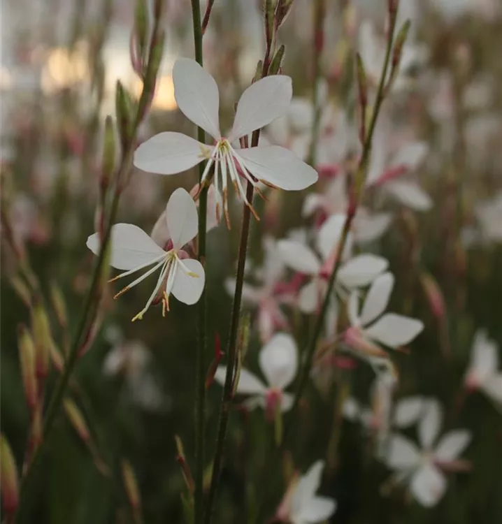 Gaura lindheimeri 'Whirling Butterflies' bildet in Rispen angeordnete, weiße Blüten ab Juli.