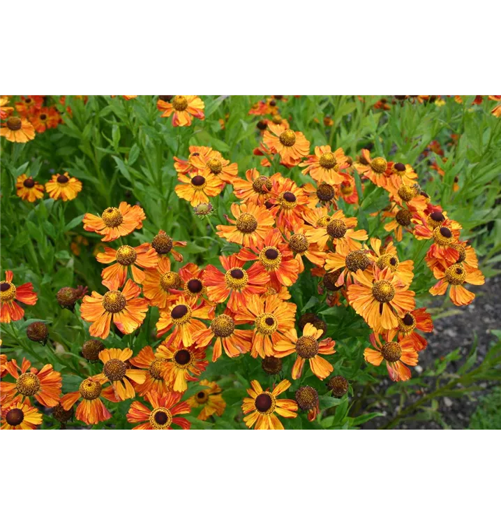 Helenium 'Wonadonga' bildet körbchenartige, orange-rote Blüten ab Juli.