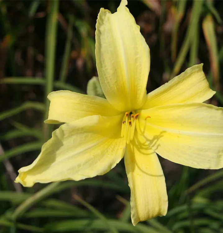 Die Taglilie (Hemerocallis) ist eine aufrechte Staude, die von Juni bis September hellgelbe, trichterförmige Blüten mit einem angenehmen Duft bildet. An einem sonnigen Standort mit durchlässigem, nährstoffreichem Boden erreicht sie gewöhnlich eine Höhe von ca. 1,2 m und wird ca. 90 cm breit. Die Taglilie ist gut frostverträglich.