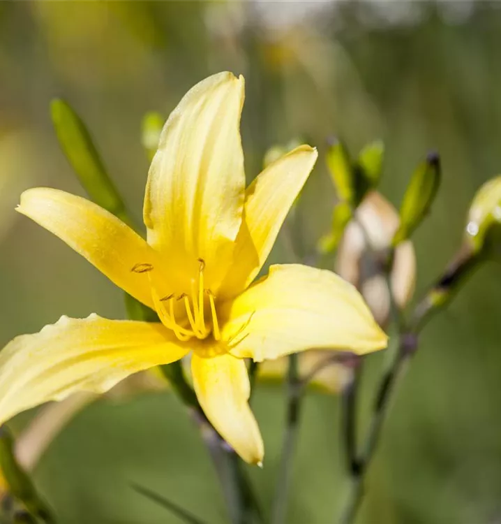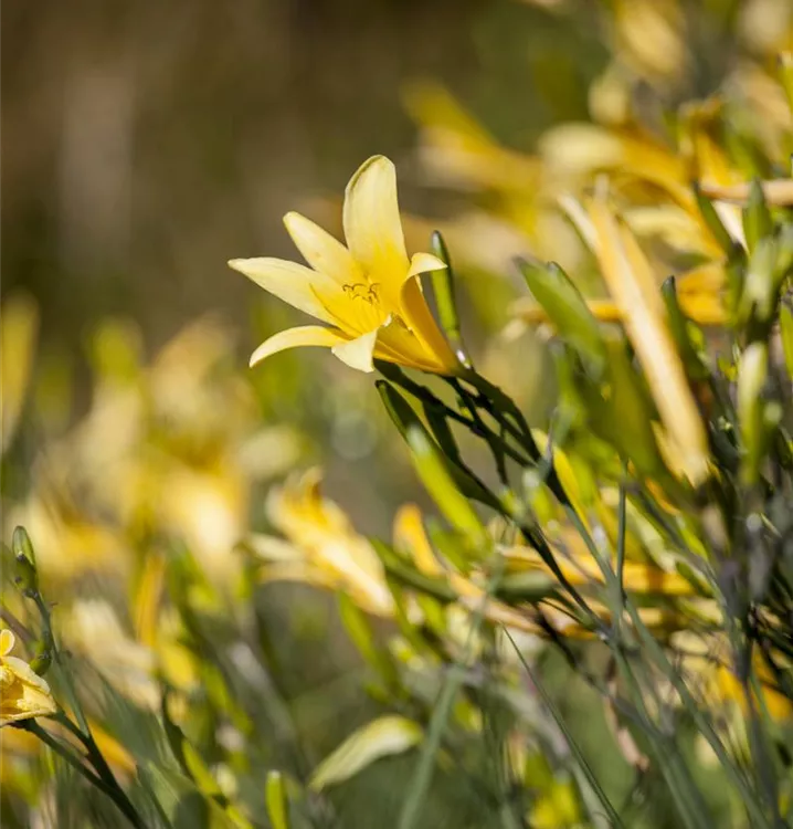 Die Frühblühende Wiesen-Taglilie (Hemerocallis lilioasphodelus) ist eine aufrechte, ausläuferbildende Staude, die von Mai bis Juni hellgelbe, trichterförmige Blüten mit einem angenehmen Duft bildet. An einem sonnigen bis halbschattigen Standort mit durchlässigem, nährstoffreichem Boden erreicht sie gewöhnlich eine Höhe von ca. 80 cm und wird ca. 60 cm breit. Die Frühblühende Wiesen-Taglilie ist gut frostverträglich.