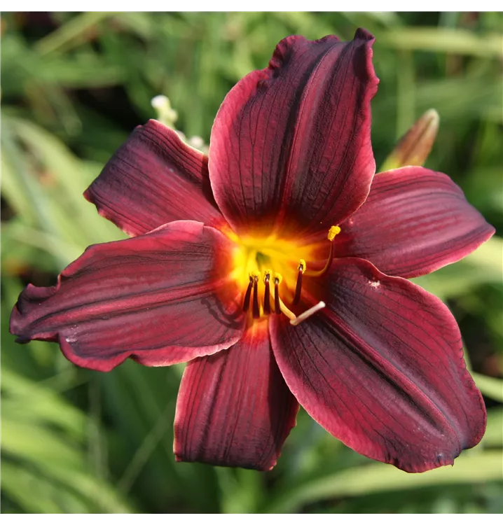 Hemerocallis 'American Revolution' bildet trichterförmige dunkelrote Blüten ab Juni. Diese verströmen einen angenehmen Duft.