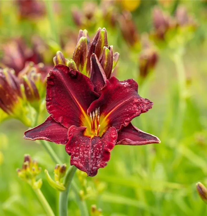 Die Garten-Taglilie 'American Revolution' (Hemerocallis) ist eine aufrechte Staude, die von Juni bis Juli dunkelrote trichterförmige Blüten mit einem angenehmen Duft bildet. An einem sonnigen Standort mit durchlässigem, nährstoffreichem Boden erreicht sie gewöhnlich eine Höhe von ca. 70 cm und wird ca. 40 cm breit. Die Garten-Taglilie 'American Revolution' ist gut frostverträglich.