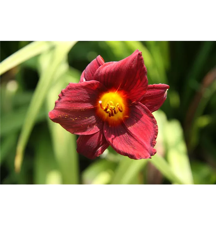 Die Garten-Taglilie 'Little Joy' (Hemerocallis) ist eine aufrechte Staude, die von Juni bis September dunkelrote, trichterförmige Blüten mit einem angenehmen Duft bildet. An einem sonnigen Standort mit durchlässigem, nährstoffreichem Boden erreicht sie gewöhnlich eine Höhe von ca. 80 cm und wird ca. 60 cm breit. Die Garten-Taglilie 'Little Joy' ist gut frostverträglich.