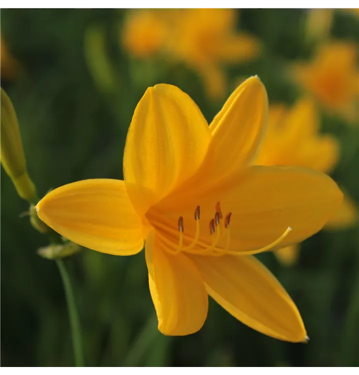 Hemerocallis 'Maikönigin' bildet trichterförmige, gelbe, hellgelbe Blüten ab Juni. Diese verströmen einen angenehmen Duft.