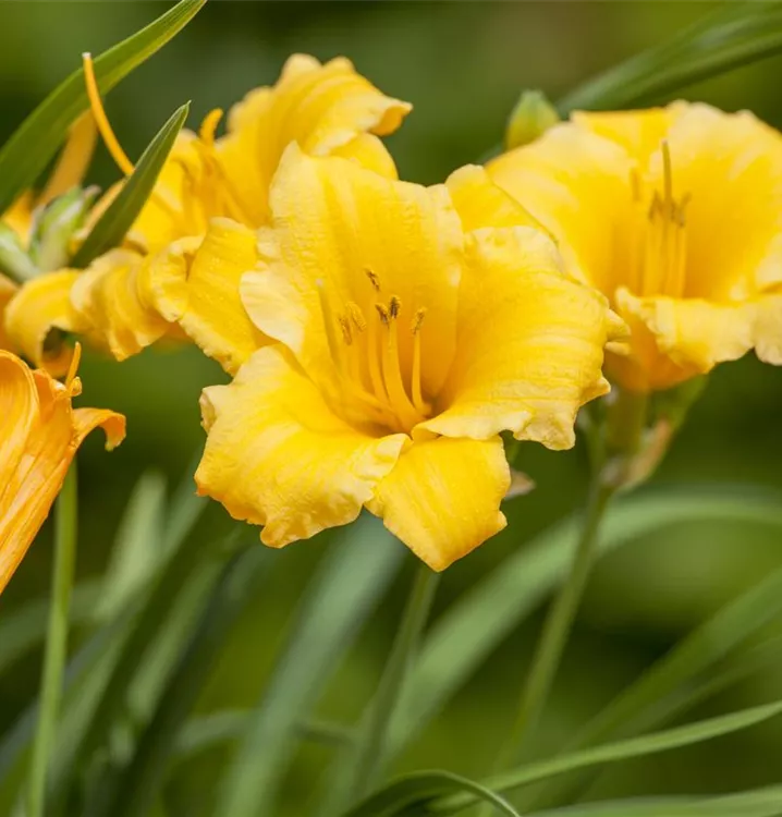 Die Garten-Taglilie 'Stella de Oro' (Hemerocallis) ist eine aufrechte, kompakte Staude, die von Juni bis Oktober goldgelbe, trichterförmige Blüten mit einem angenehmen Duft bildet. An einem sonnigen Standort mit durchlässigem, nährstoffreichem Boden erreicht sie gewöhnlich eine Höhe von ca. 40 cm und wird ca. 40 cm breit. Die Garten-Taglilie 'Stella de Oro' ist gut frostverträglich.