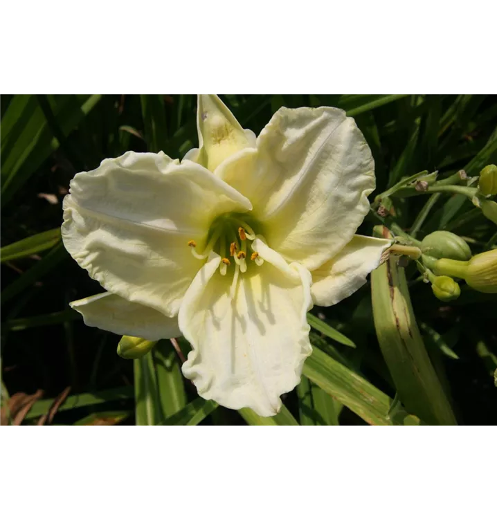 Die Garten-Taglilie 'White Temptation' (Hemerocallis) An einem sonnigen Standort mit durchlässigem, nährstoffreichem Boden erreicht sie gewöhnlich eine Höhe von ca. 1,2 m und wird ca. 90 cm breit. Die Garten-Taglilie 'White Temptation' ist gut frostverträglich.