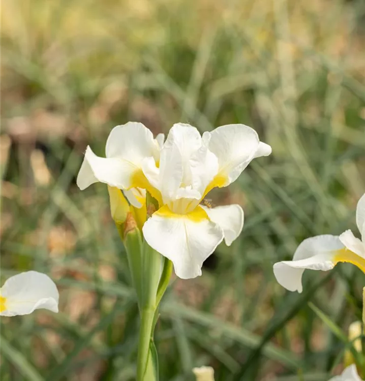 Die Bartlose Garten-Schwertlilie 'Viel Schnee' (Iris sibirica 'Viel Schnee') bildet weiße, ansehnliche Blüten von Mai bis Juni.