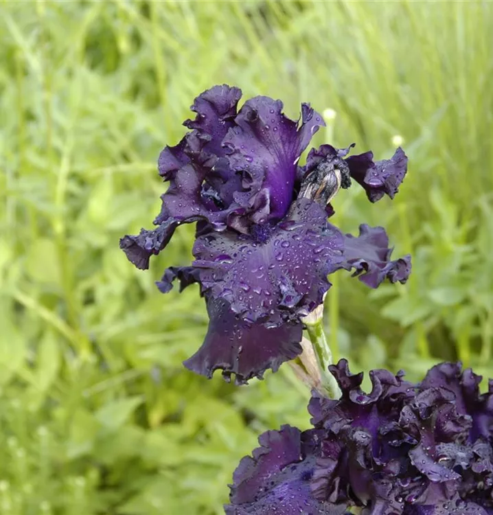 Die Hohe Bart-Iris 'Black Knight' (Iris x barbata-elatior 'Black Knight') blüht von Mai bis Juni. Die Blüten sind schwarzviolett (Self) mit leicht gewellten Rändern und ockerfarbenem Bart. Wird bis zu 70 cm hoch. Züchter: Palmer, 1948