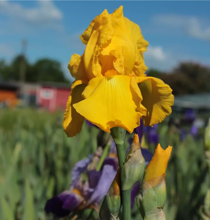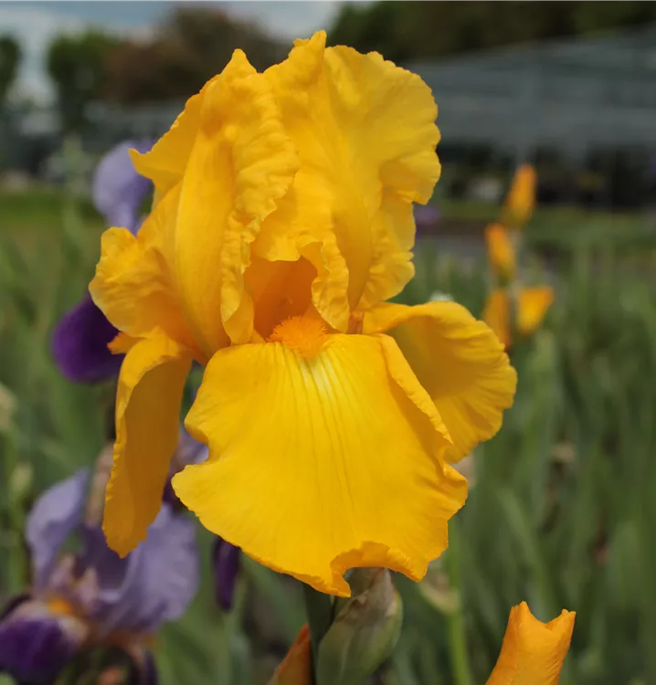 Die Hohe Bart-Iris 'Carolina Gold' (Iris x barbata-elatior 'Carolina Gold') blüht von Mai bis Juni. Die Blüten sind leuchtend goldgelb (Self) mit orangem Bart. Wird bis zu 85 cm hoch. Züchter: Powell, 1970