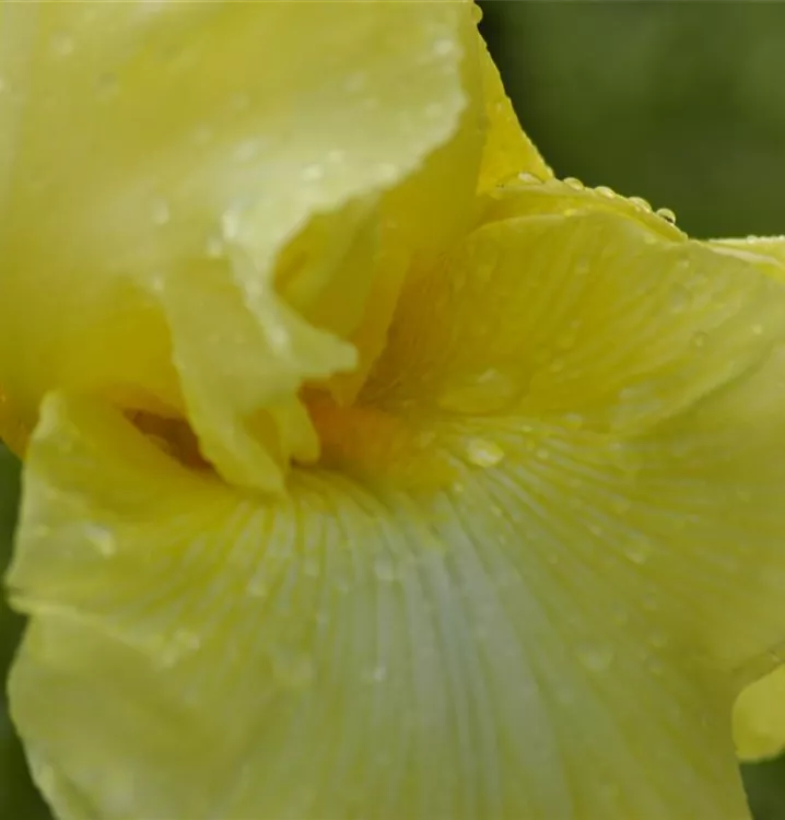 Die Hohe Bart-Iris 'Harvest of Memories' (Iris x barb.-elat. 'Harvest of Memories') blüht im Juni und remontiert im September. Die Blüten sind gelb und leicht gekräuselt. Wuchshöhe: bis 100 cm. Züchter: Zurbrigg, 1985