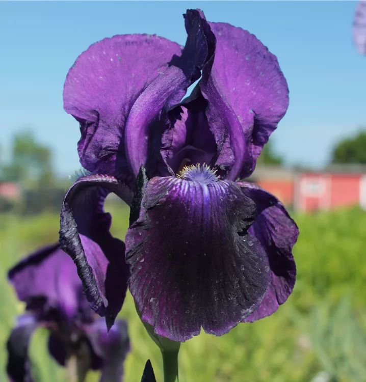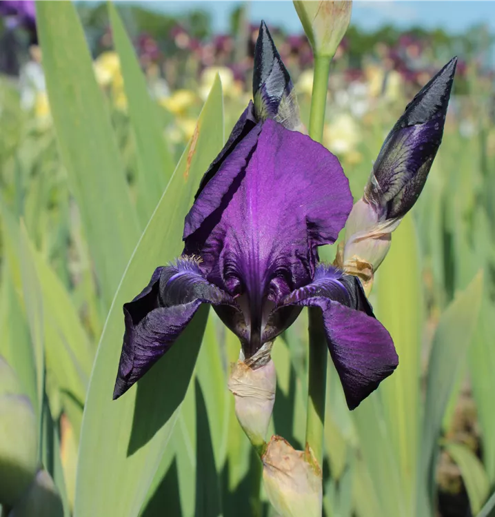 Die Hohe Bart-Iris 'Sable' (Iris x barb.-elat. 'Sable') blüht von Mai bis Juni und wird bis zu 95 cm hoch. Duftend.