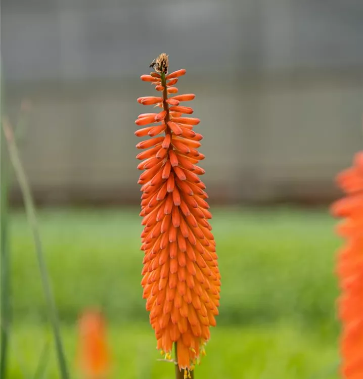 Kniphofia uvaria 'Alcazar' bildet in Kolben angeordnete, orange-rote Blüten ab Juli.
