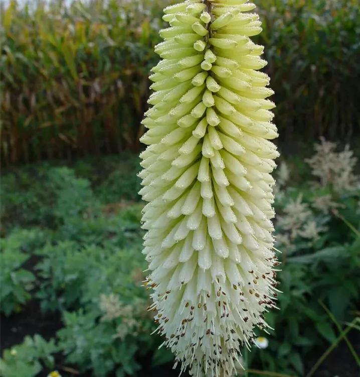 Kniphofia uvaria 'Ice Queen' bildet in Kolben angeordnete, weiße Blüten ab Juli.