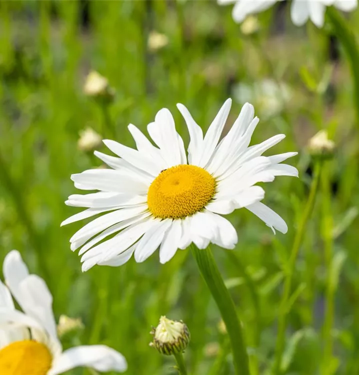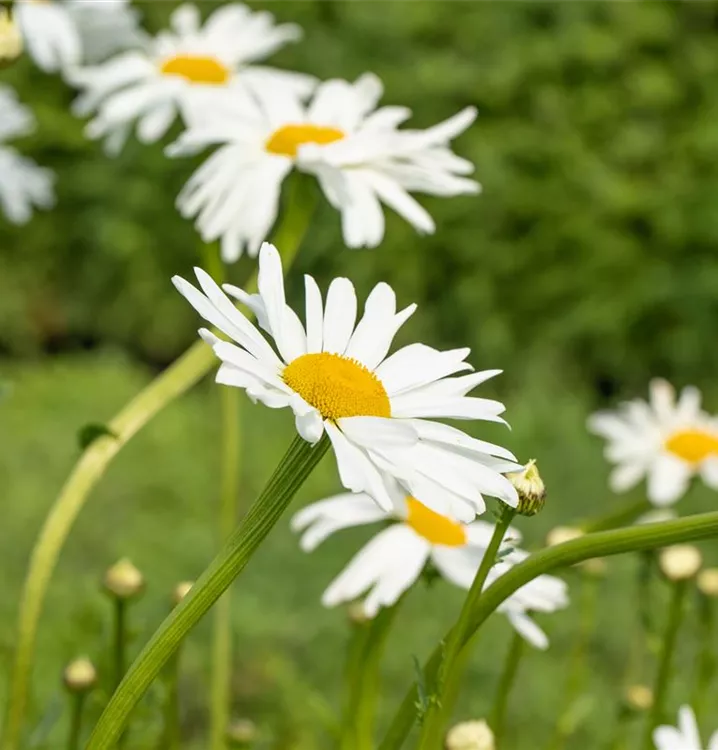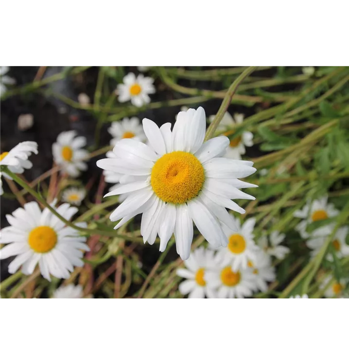 Die Königin lässt bitten, in diesem Fall in einen blühenden Frühlingsgarten, den die Kleine Garten-Margerite 'Maikönigin' mit ihren weißen Strahlenblüten mit sonnengelber Mitte zu bereichern weiß. Bis in den Juni hinein zeigen sich die vielzähligen Blüten, wenn die Pflanze ihr Königreich an einem sonnigen Standort erobern kann und der Boden frisch und nährstoffreich beschaffen ist. Im Beet harmoniert die Kleine Garten-Margerite 'Maikönigin' sehr gut mit Jakobsleiter oder Pechnelke.
