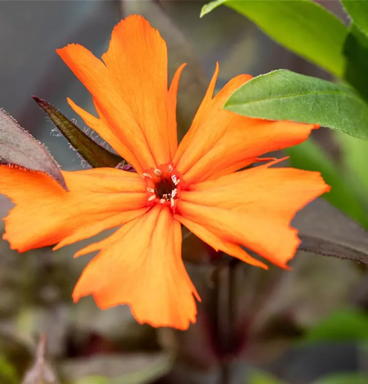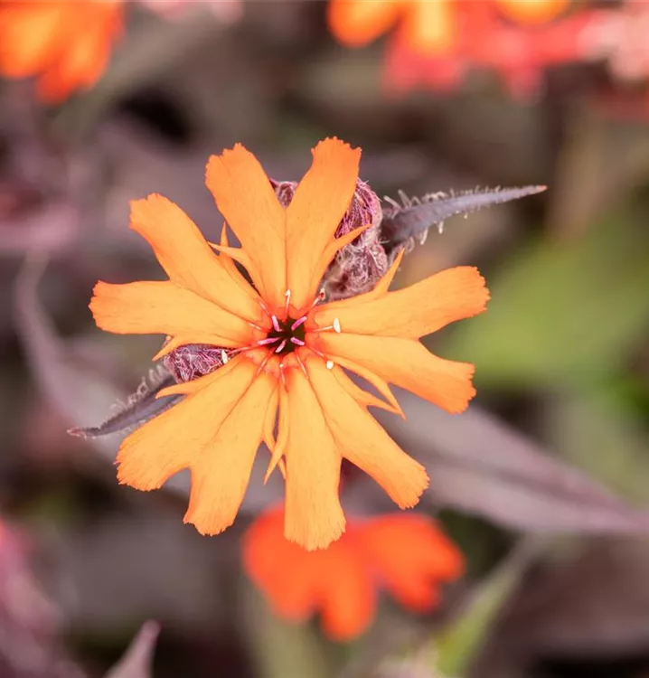 Lychnis arkwrightii 'Vesuvius' bildet radförmige, scharlachrote Blüten ab Juni.