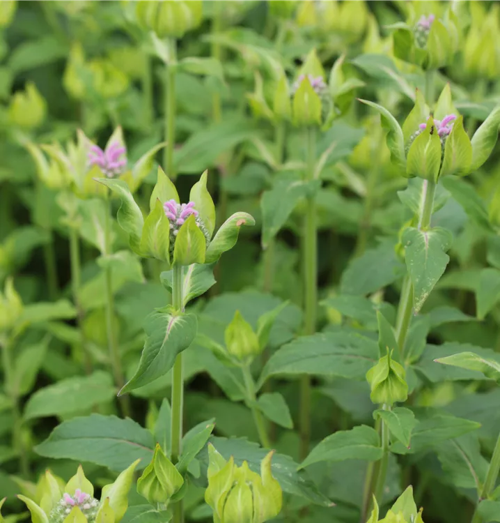 Die Minzenblättrige Indianernessel 'Pummel' (Monarda fistulosa var. menthifolia 'Pummel') blüht von Juni bis Juli und zählt zu den kompakteren Sorten. Die violetten Röhrenblüten stehen an grünen Köpfchen, die von hellgrünen Hochblättern umgeben sind. Die Sorte erreicht eine Höhe von 70 bis 90 cm.