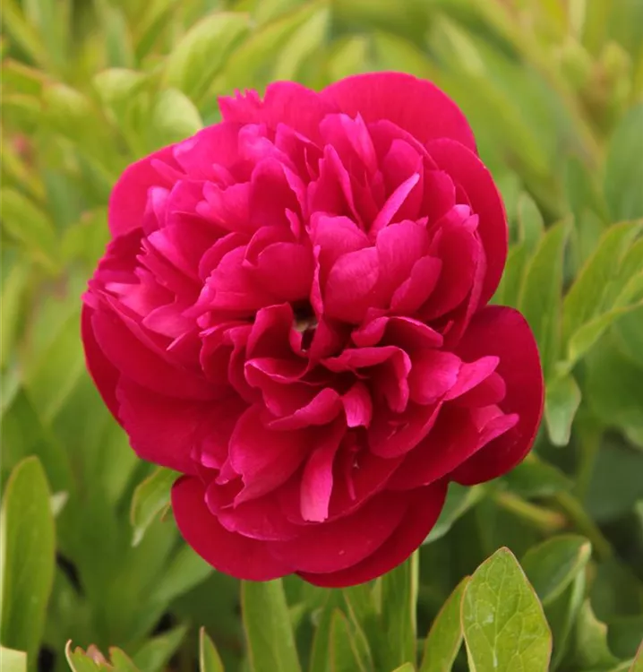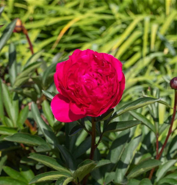 Die Bauern-Pfingstrose 'Rubra Plena' (Paeonia officinalis 'Rubra Plena') wird größer als die anderen Sorten (60-80cm) und sehr robust, fast nicht unterzukriegen. Die Blüten sind groß und gefüllt und blühen in einem violettstichigen Dunkelrot. In der Blütezeit muss die Pflanze gestützt werden.