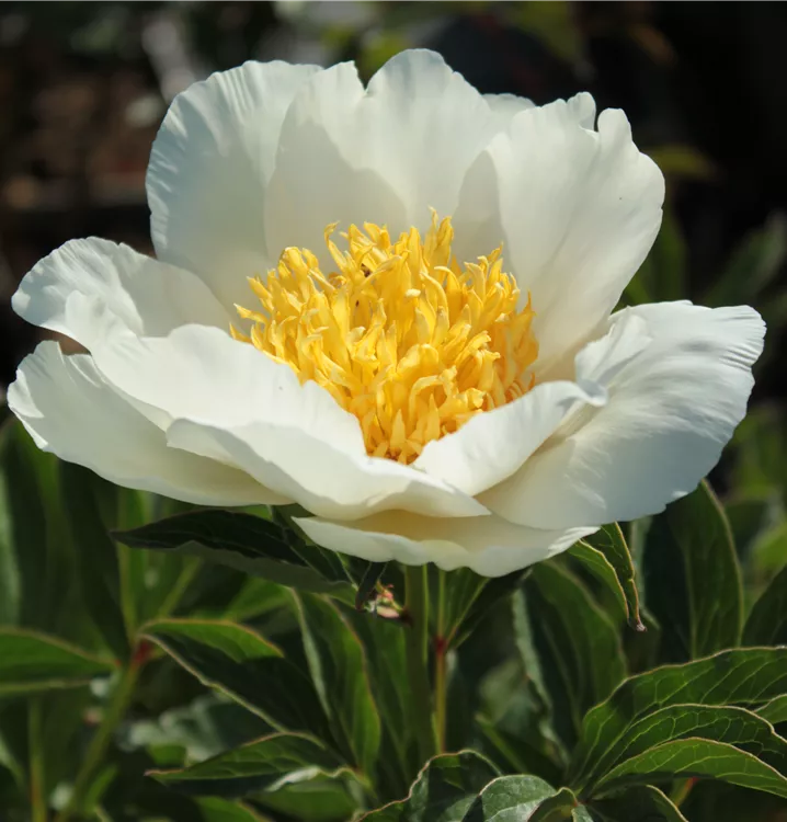 Die Edel-Pfingstrose 'Jan van Leeuwen' (Paeonia x lactiflora 'Jan van Leeuwen') ist eine historische Sorte aus den Niederlanden, gezüchtet von van Leeuwen im Jahr 1928. Sie trägt große, weiße Schalenblüten mit einem auffälligen Kranz goldgelber Staminodien (umgewandelte Staubblätter) in der Mitte, die der Sorte eine besonders elegante Wirkung verleihen. Im Aufblühen ist die Sorte zartrosa, ist aber reinweiß sobald sie sich geöffnet hat. Bleibt mit 70-80 cm Höhe etwas kompakter.