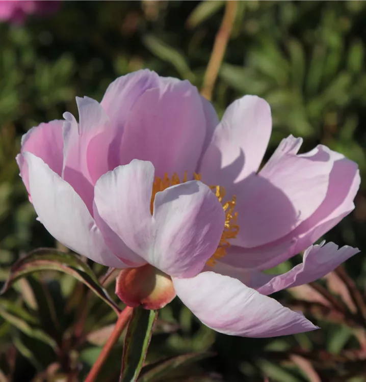 Die Edel-Pfingstrose 'Nymphe' (Paeonia x lactiflora 'Nymphe') ist eine historische Sorte aus Frankreich (Dessert, 1913). Sie hat einfache, schalenförmige rosafarbene Blüten mit leuchtend gelben Staubblättern und erreicht eine Höhe von bis zu 90 cm.