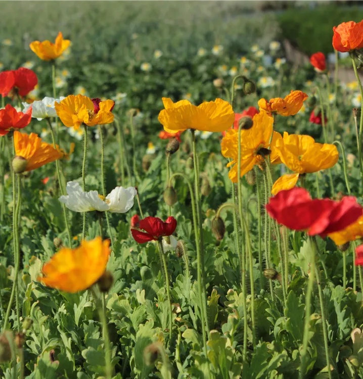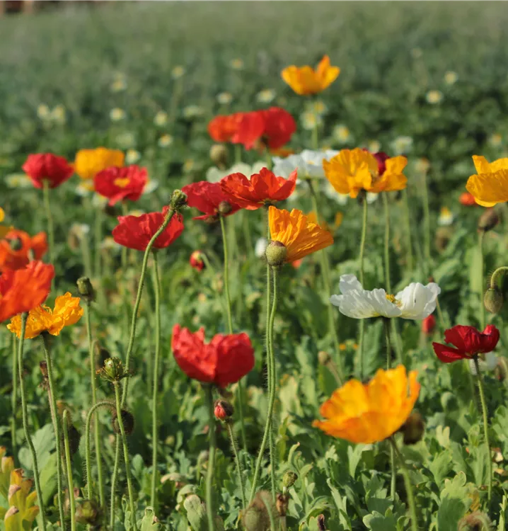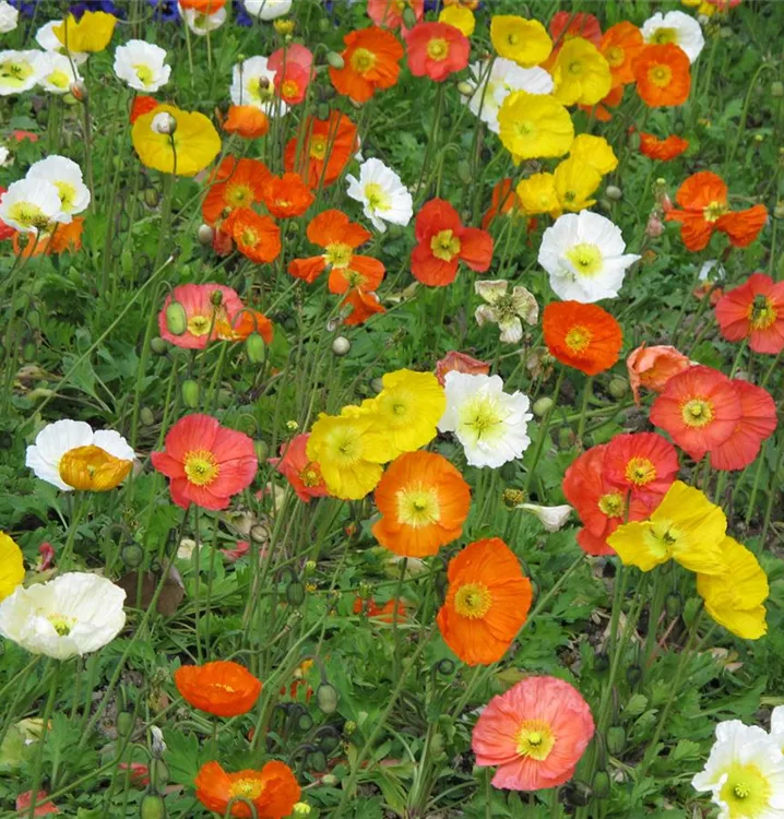 Der zwergige Island-Mohn 'Gartenzwerg' (Papaver nudicaule 'Gartenzwerg') ist eine farbige Mischung. Jede Pflanze blüht in einer anderen Farbe: in Weiß, Gelb, Orange oder Rot (auch Zwischentöne möglich).