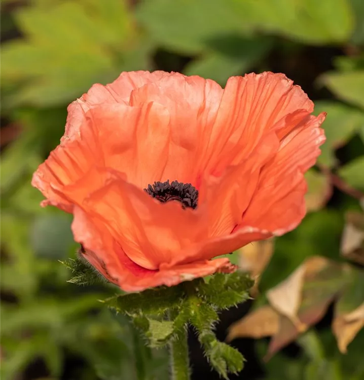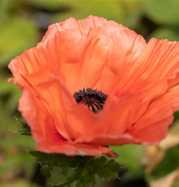 Papaver orientale 'Aglaya' bildet schalenförmige, lachsorangene Blüten ab Mai.