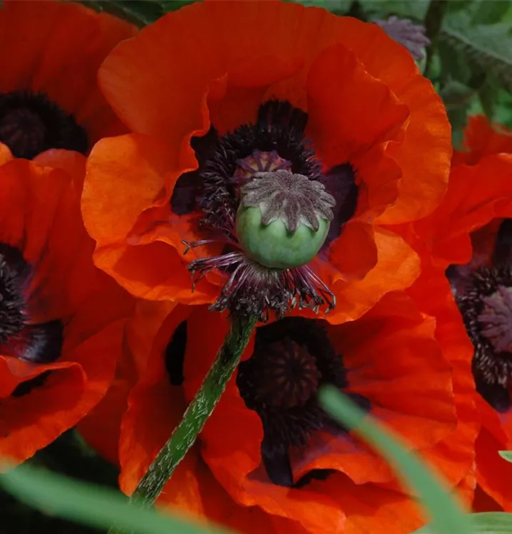 Papaver orientale 'Brillant' bildet schalenförmige, rote Blüten ab Mai.