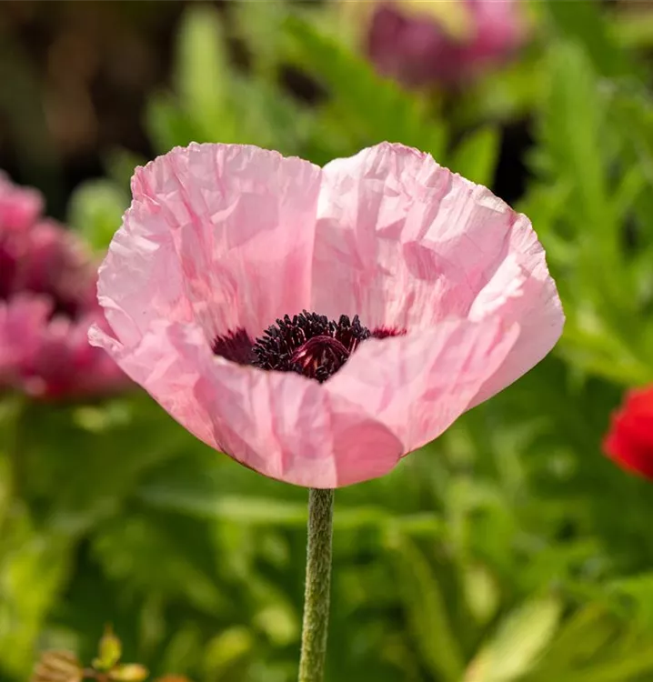 Der Orientalische Garten-Mohn 'Mrs. Perry' (Papaver orientale) ist eine aufrechte Staude, die von Juni bis Juli rosafarbene, schalenförmige Blüten bildet. An einem sonnigen Standort mit durchlässigem Boden erreicht er gewöhnlich eine Höhe von ca. 80 cm und wird ca. 50 cm breit. Der Orientalische Garten-Mohn 'Mrs. Perry' ist gut frostverträglich.