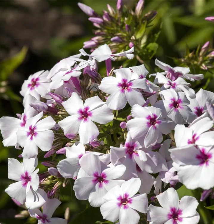 Die Hohe Garten-Flammenblume 'White Eye Flame'® (Phlox paniculata) bildet weiß-rosafarbene, leicht duftende Blüten von Juli bis August. Sie bevorzugt durchlässigen, nährstoffreichen Boden in sonniger bis halbschattiger Lage. Die Hohe Garten-Flammenblume 'White Eye Flame'® ist gut frostverträglich. Die aufrechte Staude erreicht gewöhnlich eine Höhe von ca. 40 cm.