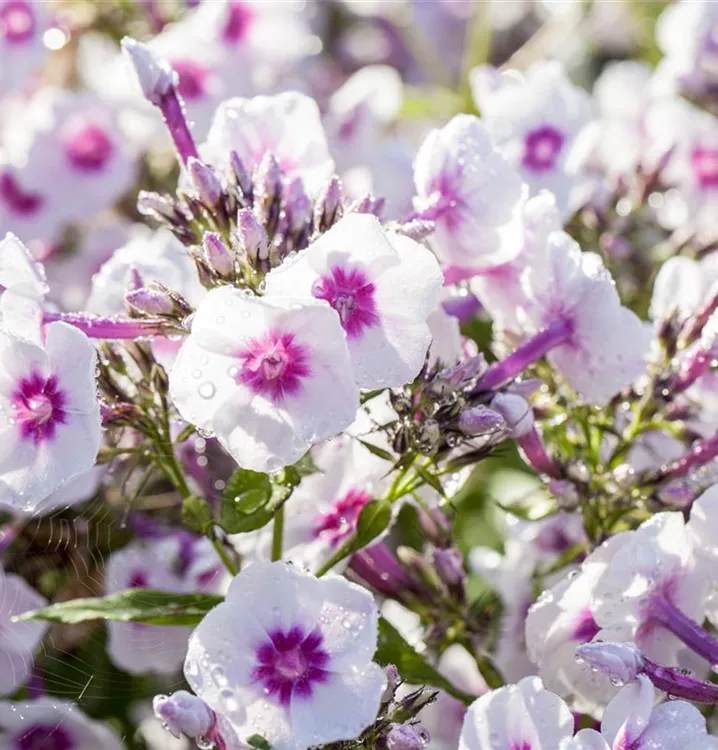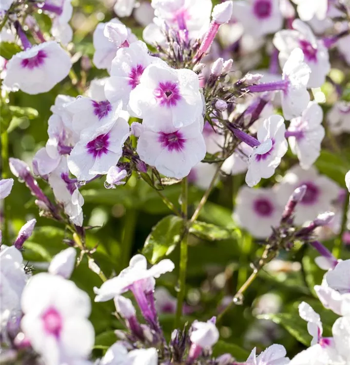 Phlox paniculata 'Bright Eyes' bildet in Dolden angeordnete, zweifarbige Blüten ab Juli. Diese verströmen einen schwachen Duft.
