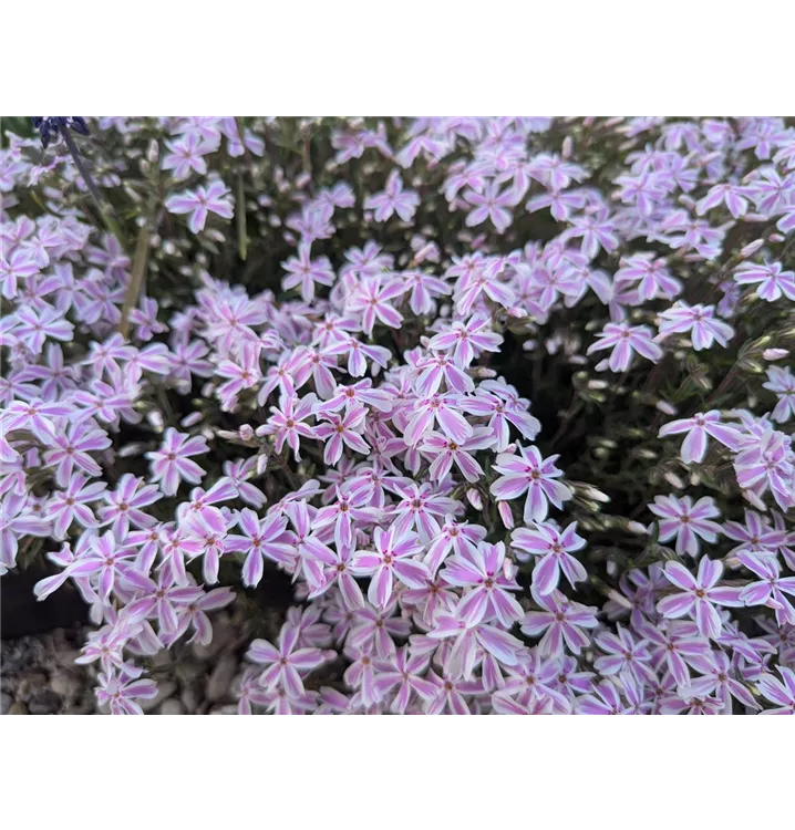 Phlox subulata 'Candy Stripes' bildet in Dolden angeordnete, weiß-rosafarbene Blüten ab April.