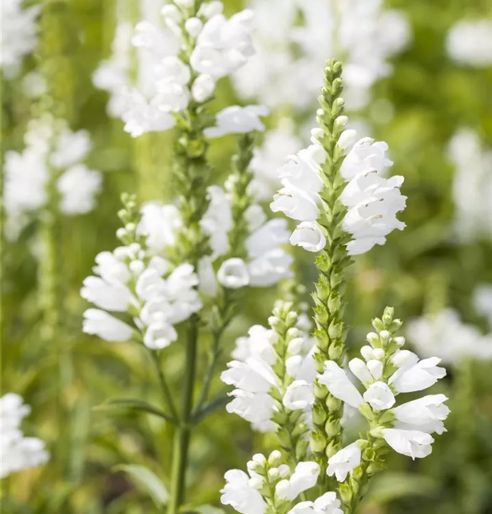 Physostegia virginiana 'Alba' bildet lippenförmige, in Ähren angeordnete, weiße Blüten ab Juni.
